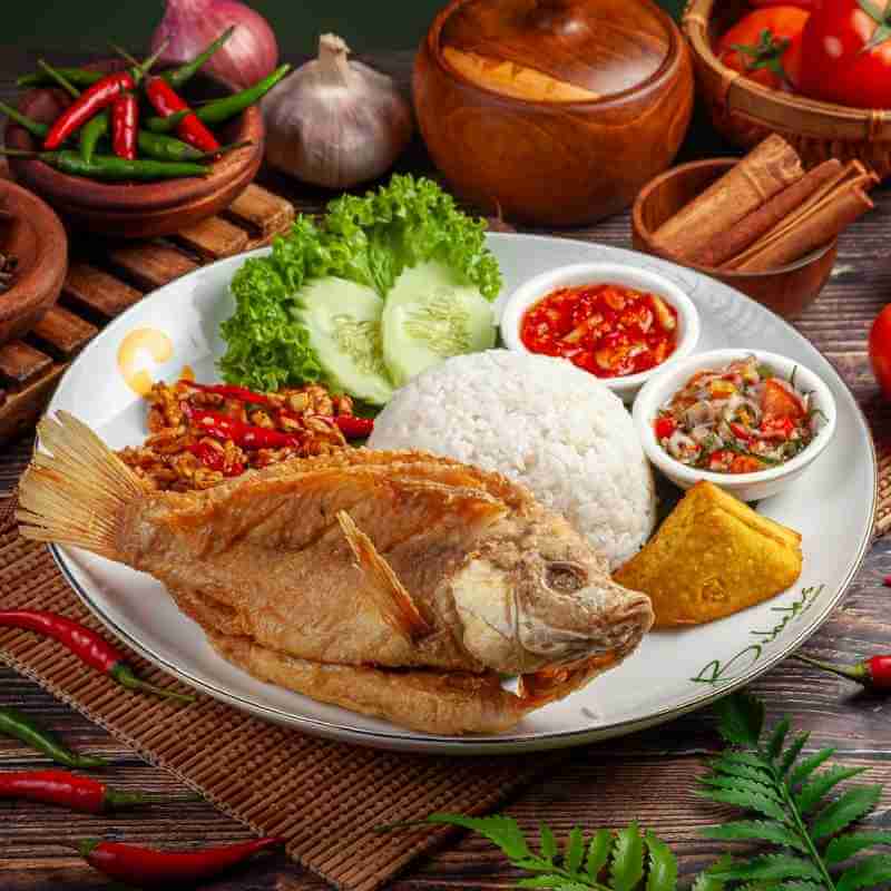 Nasi, Sambal Uleg, Sambal Matah, Talapia, Timun, Salad, Tahu, Tempe Kering
